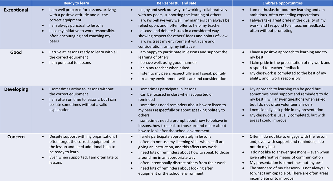 Students in all year groups will also be provided with an Attitude to Learning (AtL) grade. Teachers will apply a best fit approach to the AtL description for each category of our core expectations (embracing opportunities, ready to learn and respectful and safe) to provide one AtL grade per subject. Please see the AtL descriptor table for more information
